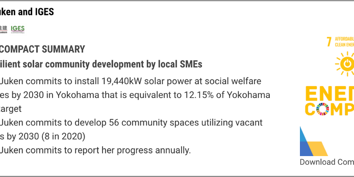 9月23日、公益財団法人地球環境戦略研究機関(IGES)様のご協力により、国連のEnergy Compactsに株式会社太陽住建の取り組みが承認、掲載されました。「Local resilient solar community development by local SMEs」というテーマにて太陽光発電設備を通した地域の防災力向上や障がい者の就労支援の他、solar crewについての取り組みを紹介いただきました。