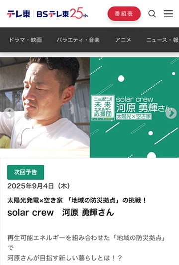 みなさまいつもお世話になっております。 9月4日22時58分から弊社Solar Crewの河原が、テレ東の番組「ニッポン!未来エネルギー応援団」に出演します。 番組の予告はこちらから確認できます。 https://www…