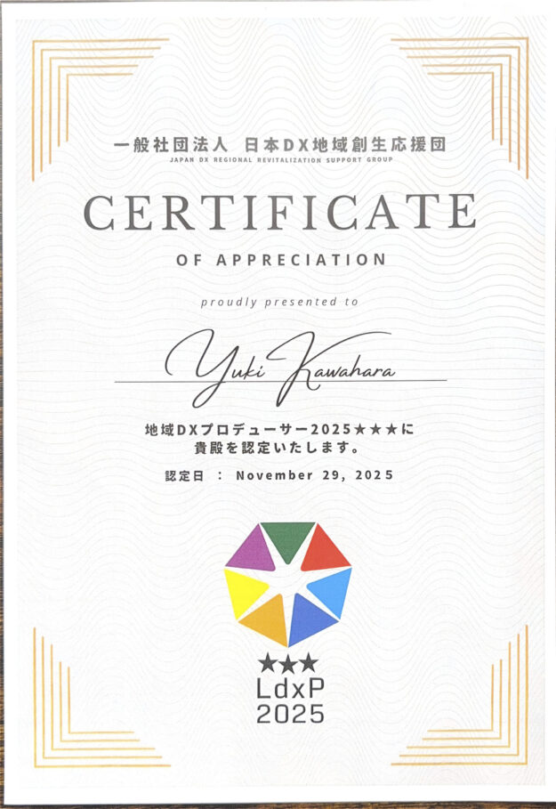 認定のご報告 このたび、事業責任者の河原が、 「地域DXプロデューサー(三つ星)」 に認定されました。 本認定を励みに、これからも地域や社会の課題に真摯に向き合い、 地方創生の一助となれるよう取り組んでまいります。
