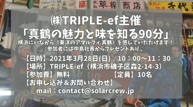 ㈱TRIPLE-ef様(法人会員)主催で、横浜にいながら真鶴町の魅力に触れるイベントを開催します。 独自の景観法「美の基準」をもち、その町並みから《東洋のアマルフィ》と呼ばれる真鶴町。真鶴で開…